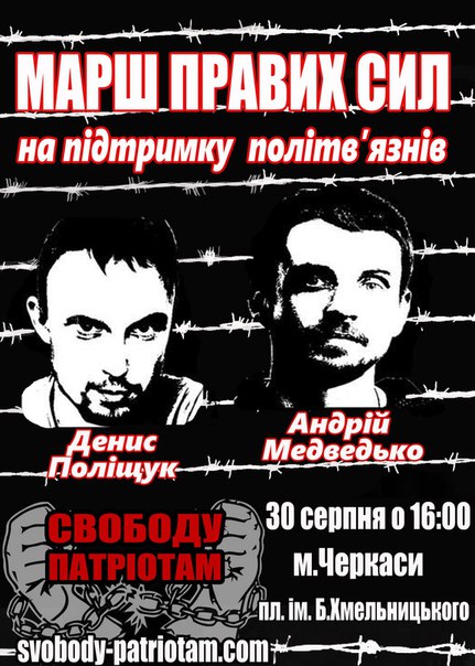 У Черкасах 30-го серпня відбудеться марш "Свободу патріотам!" в підтримку безпідставно заарештованих, нібито за "вбивство Бузини", українських націоналістів і добровольців Україно-російської війни - Дениса Поліщука та Андрія Медведька.