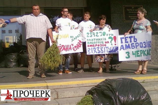Десять мішків з надзвичайно шкідливим бур’яном – амброзією полинолистою – принесли сьогодні до входу в Черкаську міськраду активісти Всеукраїнського об’єднання «Черкащани». Один із мішків висипали прямо у дверях.
