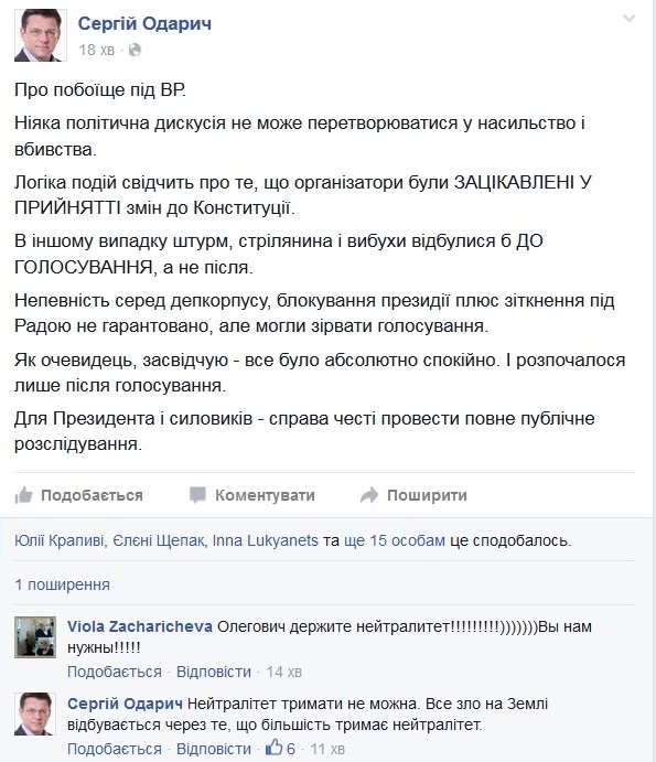 «Ніяка політична дискусія не може перетворюватися у насильство і вбивства. Логіка подій свідчить про те, що організатори були ЗАЦІКАВЛЕНІ У ПРИЙНЯТТІ змін до Конституції. В іншому випадку штурм, стрілянина і вибухи відбулися б ДО ГОЛОСУВАННЯ, а не після», – вважає Сергій Одарич.