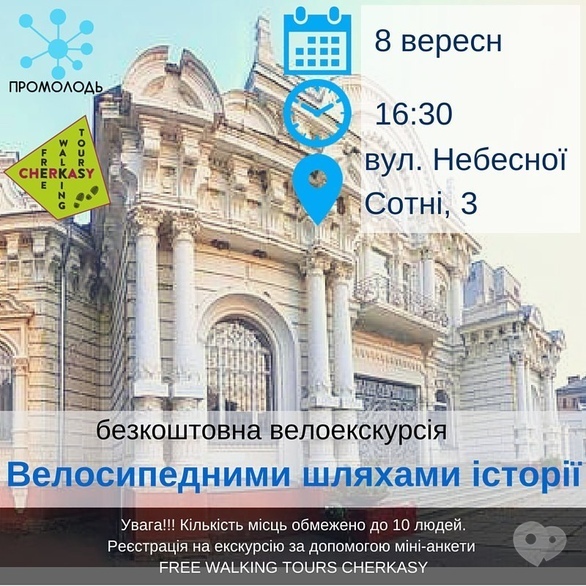 – FREE WALKING TOURS Черкаси знову кличуть туристів на велосипедах! Хочете дізнатися більше про історію свого міста, та не можете розлучитися зі своїм ровером? І не треба! Задля безпечного та комфортного проведення екскурсії встановлено обмеження – 10 осіб, – зазначили організатори.