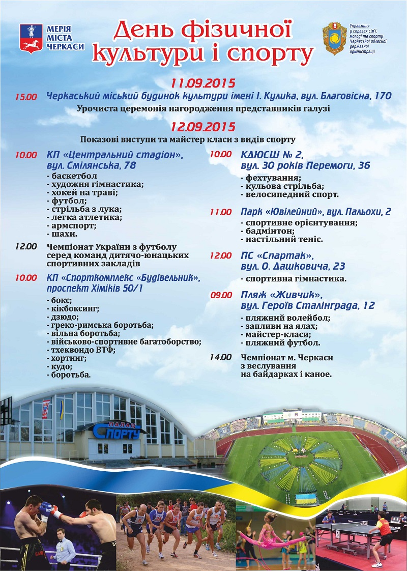 11 вересня о 15.00 в Черкаському міському будинку культури імені Івана Кулика відбудеться офіційна частина святкування Дня фізичної культури та спорту. Під час заходу, який супроводжуватимуть виступи спортсменів та музичні дарунки від творчих колективів, працівникам галузі та спортсменам вручать подяки та грамоти.