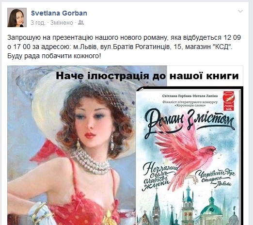 17.00 – 17.45 – авторська зустріч в магазині КСД (вул. Братів Рогатинців, 15)