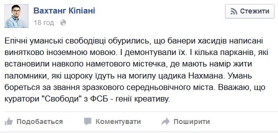 «Епічні уманські свободівці обурились, що банери хасидів написані винятково іноземною мовою. І демонтували їх. І кілька парканів, які встановили навколо наметового містечка, де мають намір жити паломники, які щороку їдуть на могилу цадика Нахмана. Умань бореться за звання зразкового середньовічного міста. Вважаю, що куратори "Свободи" з ФСБ - генії креативу», – зазначив Кіпіані.