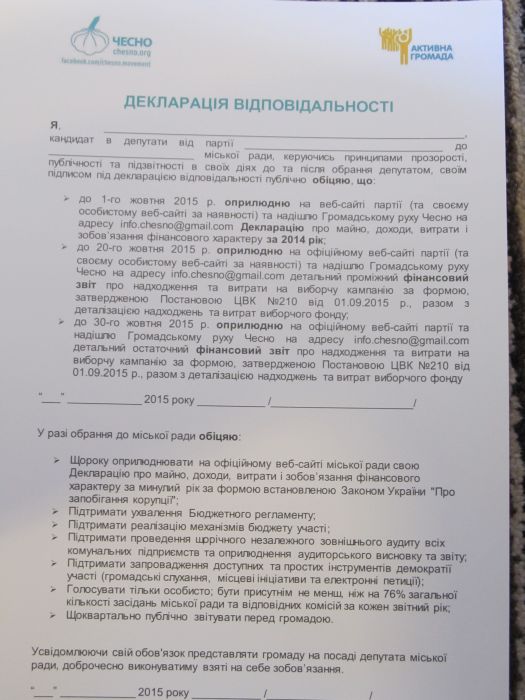 Відповідну «декларацію відповідальності» представники громадського руху «Чесно» роздали сьогодні присутнім кандидатам під час організованого «круглого столу» в Черкасах.