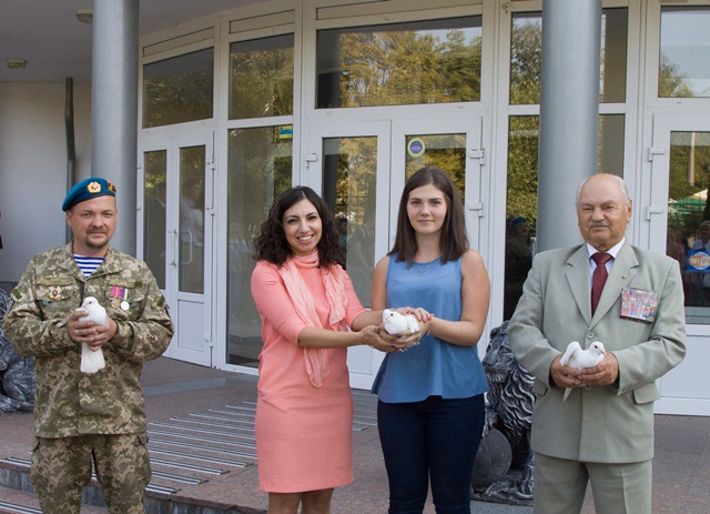 Як символ миру для нашої Батьківщини, ректор університету разом із головою студентської ради Вікторією Кириченко і запрошеними гостями відпустили в небо живих білих голубів.