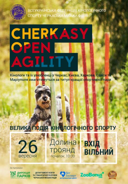 26 вересня 10:00 (субота) у парку "Долина троянд" відбудеться велика подія кінологічного спорту «CHERKASY OPEN AGILITY» (Відкритий чемпіонат Черкас з аджиліті).