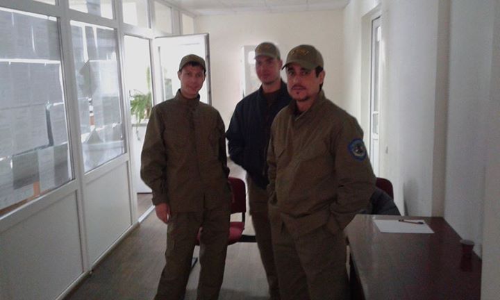 Їх привів кандидат на посаду депутата в міськраду Олексій Колісник (БПП "Солідарність"). За його словами, до нього звернувся голова комісії Анатолій Кошовий і попросив забезпечити правопорядок та охорону приміщення ТВК. О. Колісник підтвердив те, що троє чоловіків є охоронцями приватної фірми, до якої він має відношення.