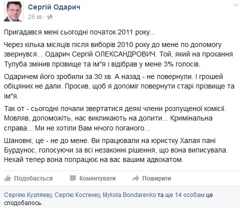 «Пригадався мені сьогодні початок 2011 року... Через кілька місяців після виборів 2010 року до мене по допомогу звернувся... Одарич Сергій ОЛЕКСАНДРОВИЧ. Той, який на прохання Тулуба змінив прізвище та ім"я і відібрав у мене 3% голосів. Одаричем його зробили за 30 хв. А назад - не повернули. І грошей обіцяних не дали. Просив, щоб я допоміг повернути старі прізвище та ім"я.