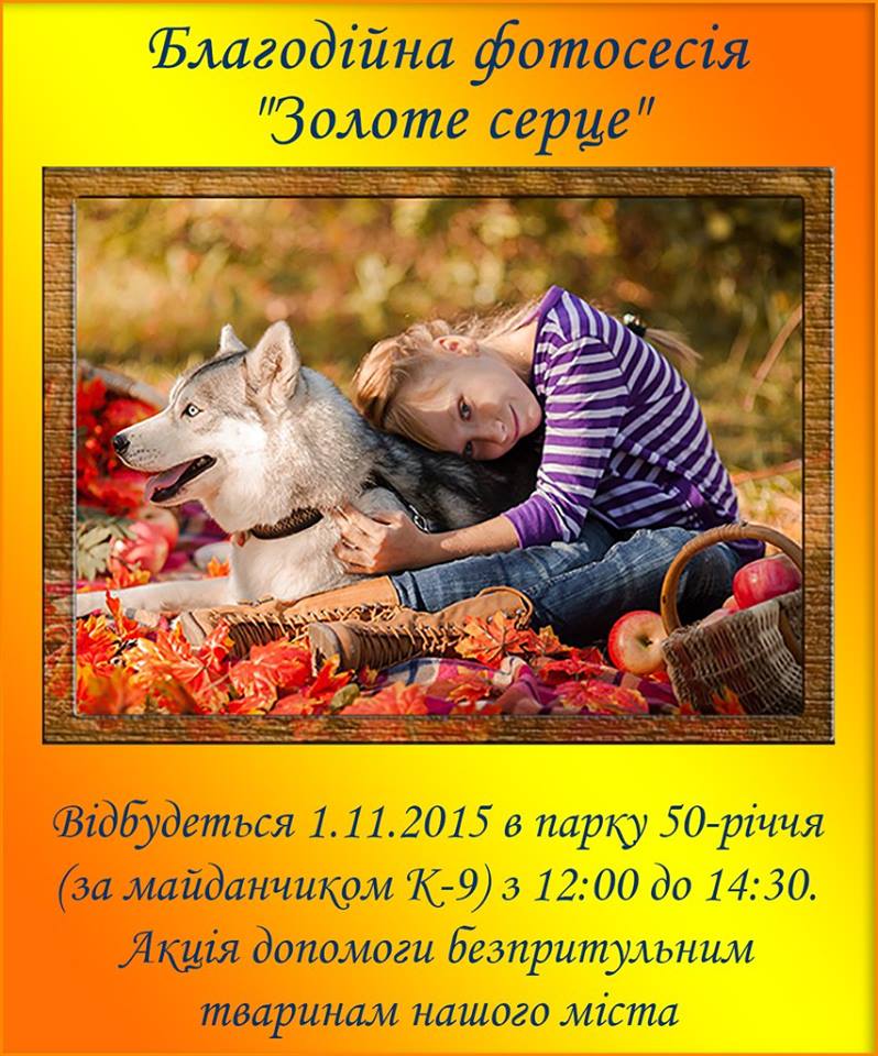 В парку «50-річчя» за майданчиком К-9 відбудеться благодійна фотозйомка «Золоте серце». Зробити якісні світлини на фоні осінніх краєвидів із тваринами черкасці зможуть 1 листопада. Триватиме акція з 12.00 до 14.30.