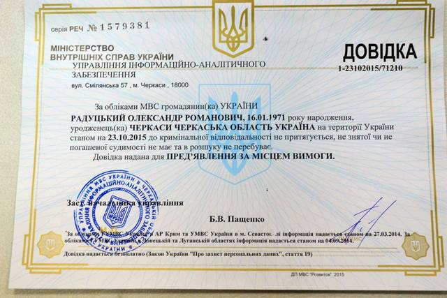 За словами Радуцького, йому зателефонувала його донька із запитаннями, чи правда пишуть, що він – двічі судимий, і «по зоні бігав із битою». Олександр Романович пред’явив журналістам довідку з міліції, що він «станом на 23.10.2015 до кримінальної відповідальності не притягується, не знятої чи не погашеної судимості не має та в розшуку не перебуває».