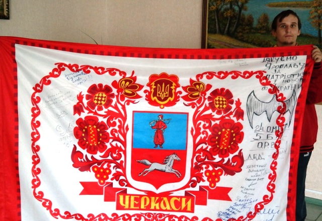 Прапор Черкас зі словами побажань та підписами бійців 24-ї окремої механізованої бригади 5 батальйону розвідки цього тижня привезли до нашого міста волонтери громадської організації «Самооборона Майдану Черкас».