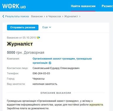 На одному з інтернет-ресурсів, який спеціалізується на пошуку роботи та працівників, з’явилось оголошення громадської організації, представники якої проводять акцію протесту під Черкаською обласною прокуратурою. Заступник голови ГО «Організований захист громадян» Едуард Синяговський у коментарі «Прочерку» повідомив, що недавно громадська організація створила інформагентство, для якого потрібен журналіст.