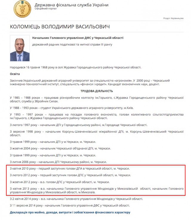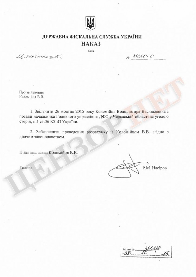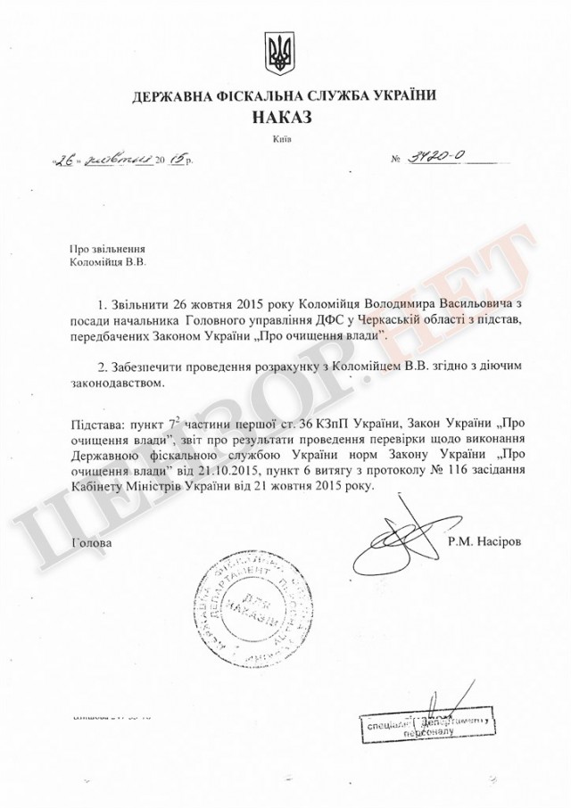 «26 жовтня наказом голови ДФС України Р.Насірова №3720-0в порядку Закону України «Про очищення влади» було звільнено начальника Головного управління ГФС в Черкаській області Коломійця Володимира Васильовича, – пише Сергій Іванов у своєму блозі на «Цензор.нет». – Як ми бачимо, всі підстави для законного звільнення Коломійця в порядку люстрації присутні.
