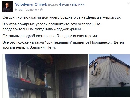 Знищений вогнем у Черкасах дачний будинок виявився будинком сина екс-регіонала та екс-нардепа, який зараз у бігах, Володимира Олійника. Про це він написав у «Фейсбуці», знайшовши чомусь у пожежі слід Порошенка.