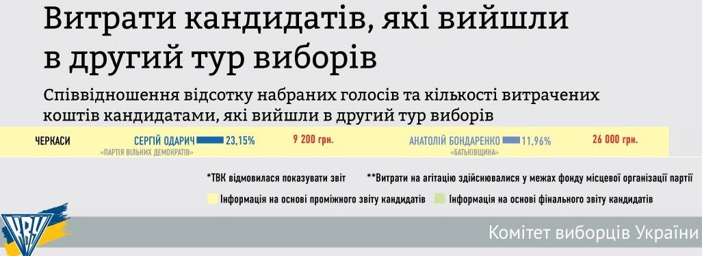Більшість кандидатів на посади міських голів України, які вийшли в другий тур виборів, витратили від 100 000 до 1 000 000 грн. Дані наведені згідно проміжних та фінальних фінансових звітів кандидатів, які вони подавали у ТВК.