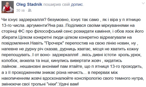 «Чи існує задзеркалля? – міркує Олег Стадник. – Безумовно, існує, так само, як і віра у п’ятницю 13-го числа... Аргументи?! Нараз... Поділився своїми міркуваннями на сторінці «Фейсбуку» про філософський сенс розкидати каміння і обов’язок його збирати. Цілком конкретні люди цілком конкретно відреагували на повідомлення. Навіть «Прочерк» перепостив на свою лінію новин, ну, напевне не дурну річ сказав, дурниць хватає, місця не хватить кожну перепощувать... І от воно – задзеркалля!.. Якісь дивні істоти – кроль, урюк, колобок, анжела та інші кинулись вивертати жовч, кидатись лайном... Нешановні аноніми! пам’ятайте, що п’ятниця 13-го проходить, а з її проходженням зникає різна нечисть... В перервах між накопиченням жовчі вдосконалюйте конспірологію свого темного нутра, змінюючи свої трольні "ніки". Удачі вам!»