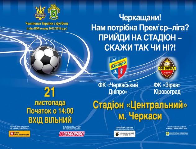 Керівництво футбольного клубу «Черкаський Дніпро» ухвалило рішення, що 21 листопада вхід на матч між командами «Черкаський Дніпро» і «Зірка» (Кіровоград) буде вільний, повідомляє офіційний сайт клубу. Початок матчу, що відбудеться на черкаському стадіоні «Центральний», о 14:00.