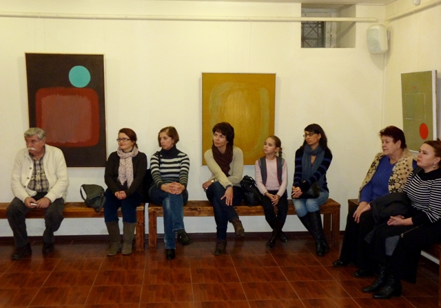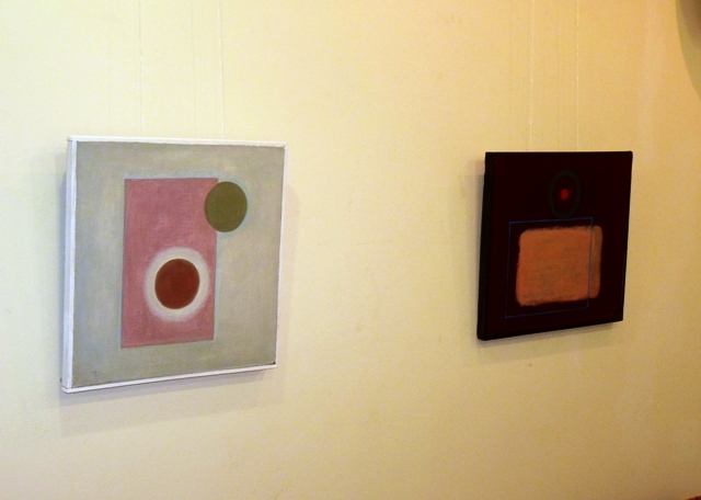 На картинах на фоні різних кольорів зображені кола, квадрати, інші фігури тощо.
