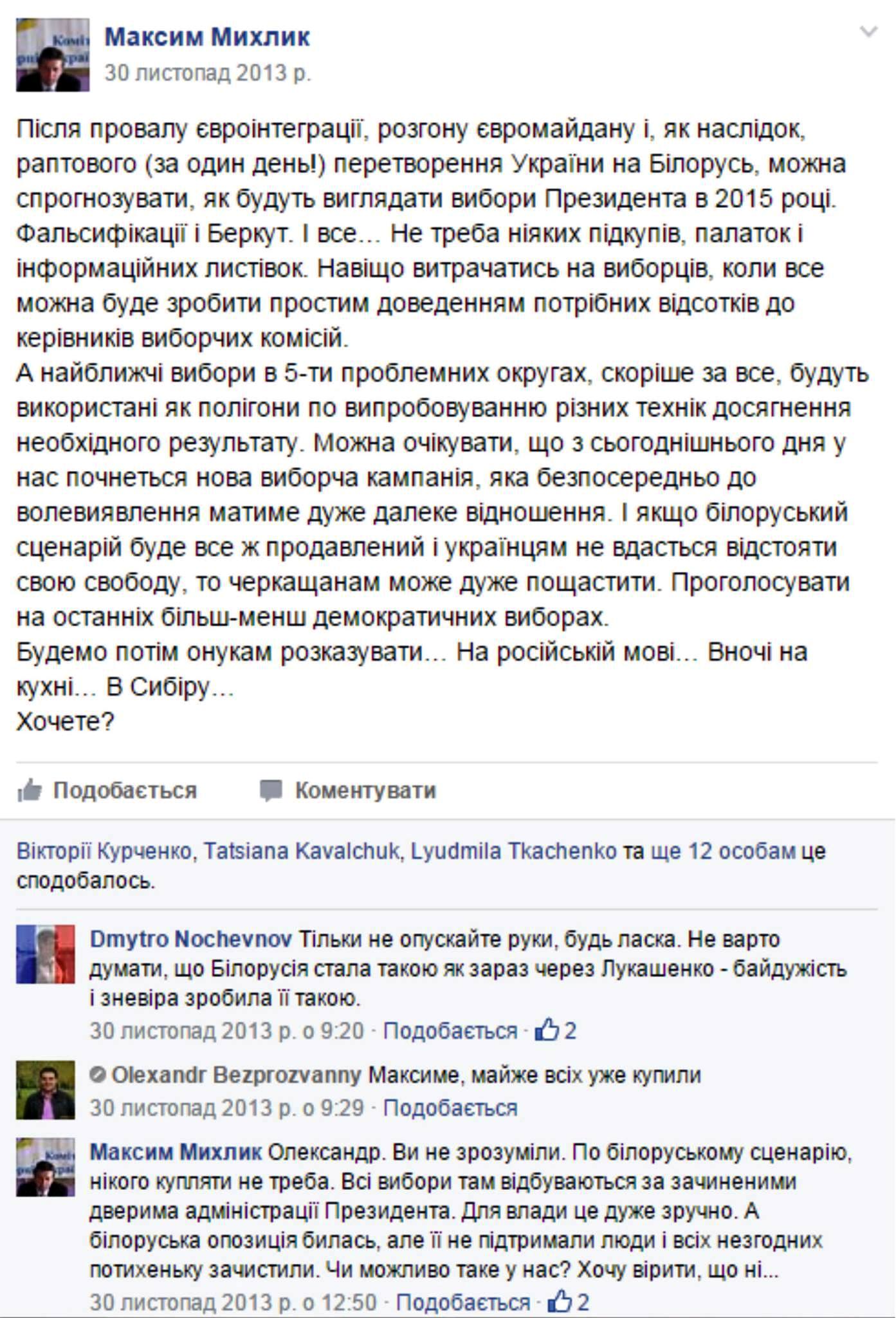 «Ось випадково натрапив на свій пост дворічної давнини. Відразу після розгону і побиття студентів на Майдані його написав. Як же добре іноді помилятись. І як же добре, що все ж відстояли ми своє право і гідність. Україна не піддалась білорусизації, перемогла Януковича і довела (в першу чергу, сама собі), що ми відбулись, як Нація. Мало хто вірив, що це взагалі можливо. Я, особисто, дуже сумнівався.