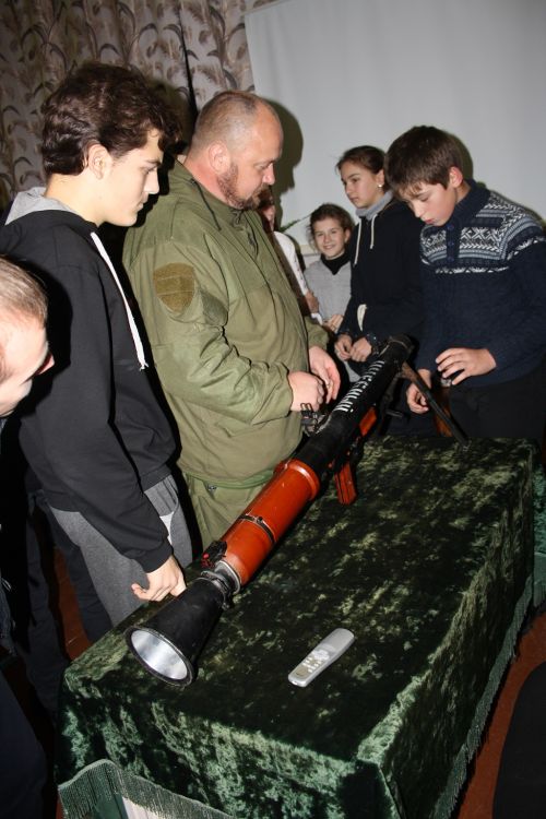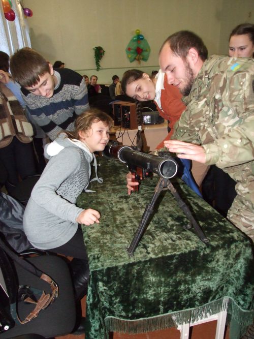 Учні із-за хопленням слухали розповіді бійців,задавали питання, приміряли військове спорядження та вчилися збірати і розбірати зброю. На жаль, військомат вилучив у школи всі учбові одиниці зброї, назад її не повернули і тому, на уроках довійськової підготовки, юнаки навчаються на дерев’яному муляжі.