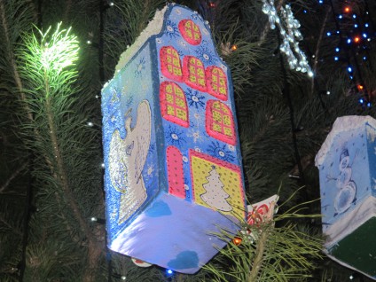 Коли ж почало темніти ялинка засяяла яскравими вогнями. Та цьогоріч головною її окрасою стали іграшки у вигляді голубів та будиночків. Їх спеціально для ялинки виготовляла черкаська дітвора.