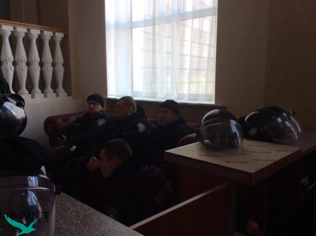 На вході до приміщення стоять близько 10 правоохоронців. Вони перевіряють усіх, хто заходить у приміщення, пише infomist.ck.ua