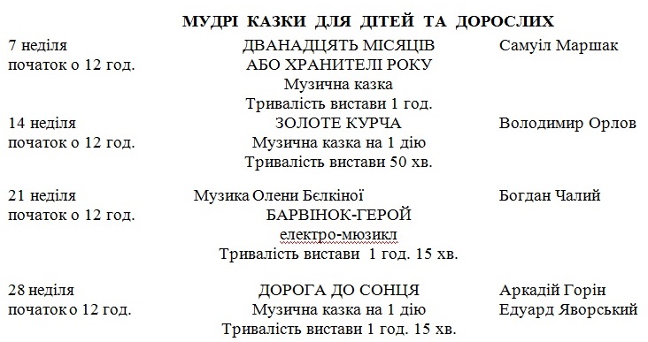 Початок вечірніх вистав – о 18 год. 30 хв.; субота, неділя – о 17 год.; дитячих о 12 год.