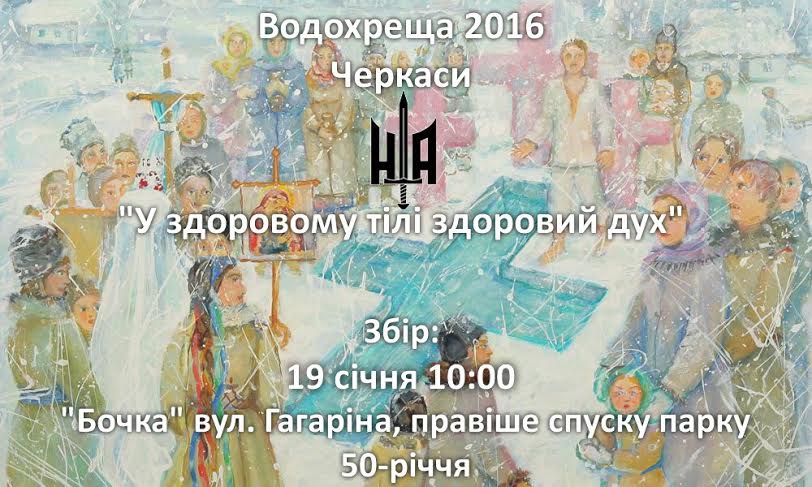 Громадська організація “Всеукраїнський молодіжний рух “Національний Альянс” запрошує черкащан на Водохреща. “У здоровому тілі здоровий дух” - цьогорічні купання відбуватимуться саме під цим гаслом, оскільки купання це не тільки традиція, а ще і гарна можливість перебороти себе.