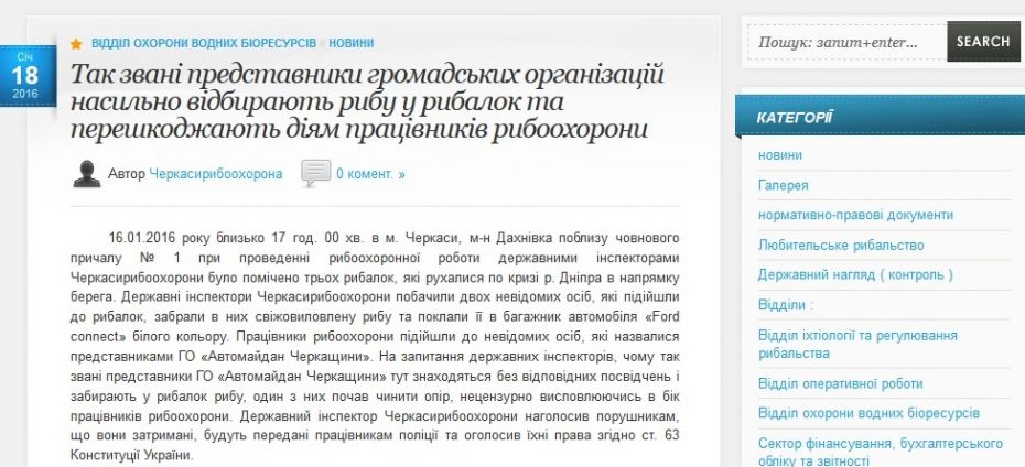 Працівники рибоохорони підійшли до невідомих осіб, які назвалися представниками ГО «Автомайдан Черкащини». На запитання державних інспекторів, чому так звані представники ГО «Автомайдан Черкащини» тут знаходяться без відповідних посвідчень і забирають у рибалок рибу, один з них почав чинити опір, нецензурно висловлюючись в бік працівників рибоохорони. Державний інспектор Черкасирибоохорони наголосив порушникам, що вони затримані, будуть передані працівникам поліції та оголосив їхні права згідно ст. 63 Конституції України.
