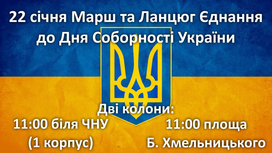 Дві колони із людей, які символізуватимуть УНР І ЗУНР, рушать до Соборної площі об 11:15. На Соборній площі колони воз'єднаються і учасники ходи одразу розпочнуть створювати Ланцюг Єднання. О 12:00 всі візьмуться за руки і заспівають гімн України. Після заходу запрошуємо долучитися до покладання квітів біля пам'ятного хресту героям Небесної сотні.