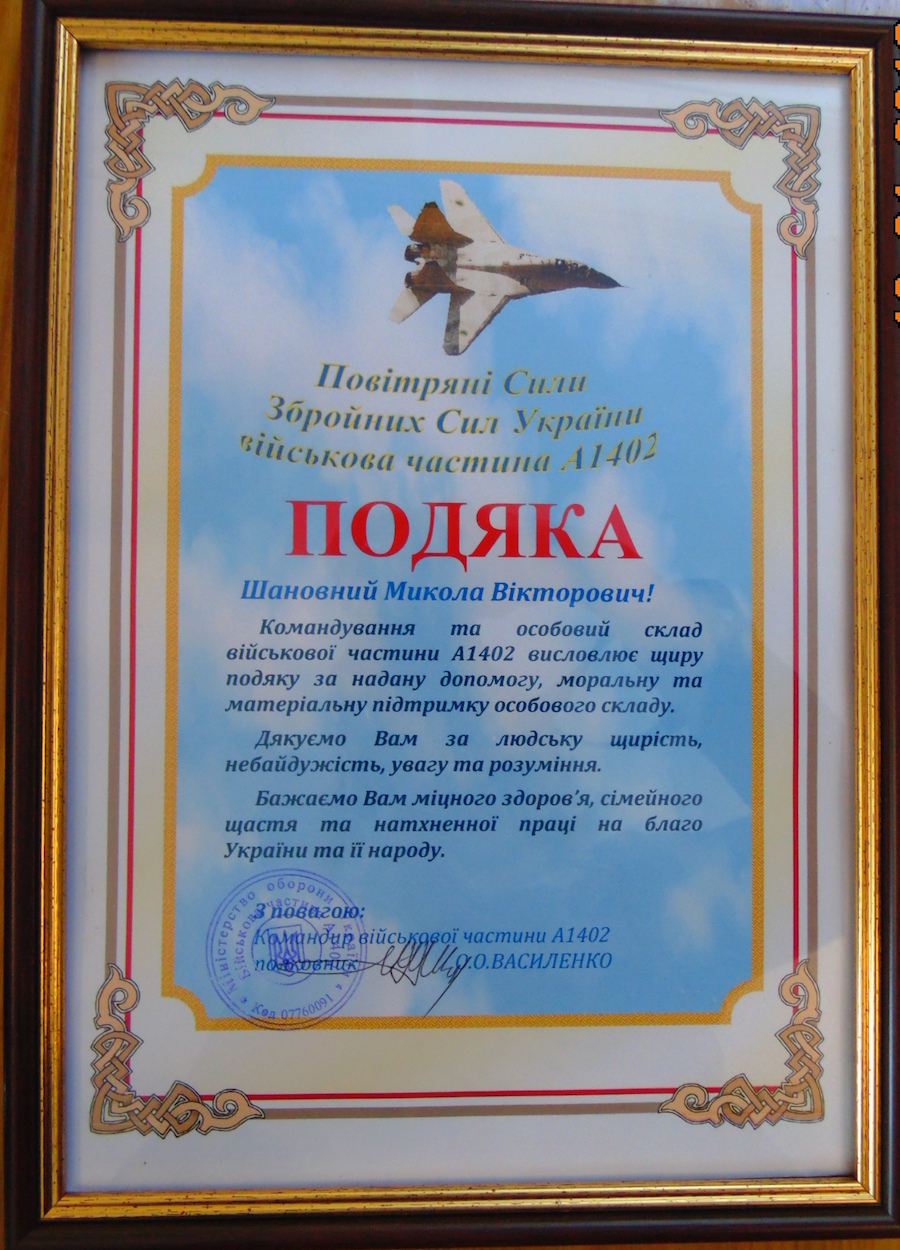 Приємною кореспонденцією розпочався 2016 рік для ДП «Золотоніське лісове господарство». Командування та особовий склад військової частини А1402 надіслали подяку лісівникам за надану допомогу, моральну та матеріальну підтримку особового складу.