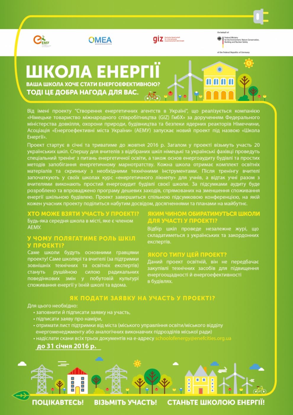 Спершу для вчителів з відібраних шкіл німецькі та українські фахівці проведуть спеціальний тренінг з питань енергетичної освіти, а також основ енергоаудиту будівлі та простих методів запобігання марнотратству. Кожна школа отримає комплект освітніх матеріалів та скриньку з необхідними технічними інструментами. Після тренінгу вчителі започаткують у своїх школах «курс енергетичного лікнепу» для учнів, а відтак учні разом з учителями виконають простий енергоаудит будівлі своєї школи. За підсумками аудиту буде розроблено та впроваджено програму дешевих заходів, спрямованих на зменшення споживання енергії шкільною будівлею.