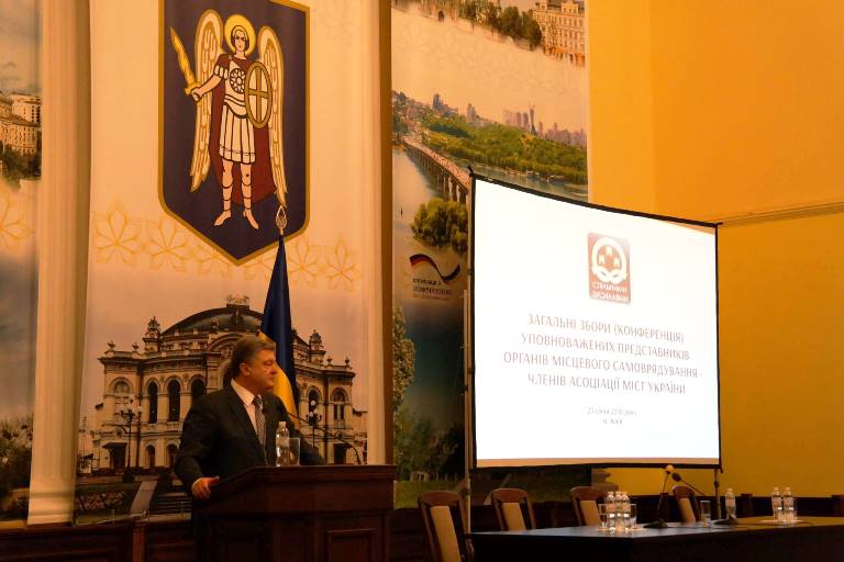 Президент Петро Порошенко взяв участь у Загальних зборах уповноважених представників органів місцевого самоврядування – членів Асоціації міст України. Глава держави присвятив свій виступ децентралізації – тому, що вже зроблено і вже дає перші результати, а також тому, що ще необхідно зробити – та закликав присутніх мерів міст до спільної роботи над втіленням децентралізації у життя.