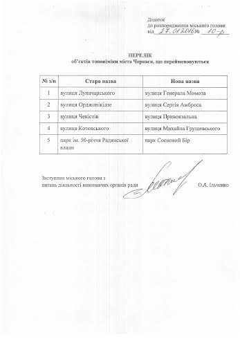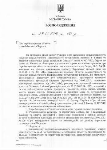 27 січня 2016 року міський голова Анатолій Бондаренко підписав розпорядження про перейменування об'єктів топоніміки м. Черкаси, повідомляє офіційний сайт Черкаської міськради.