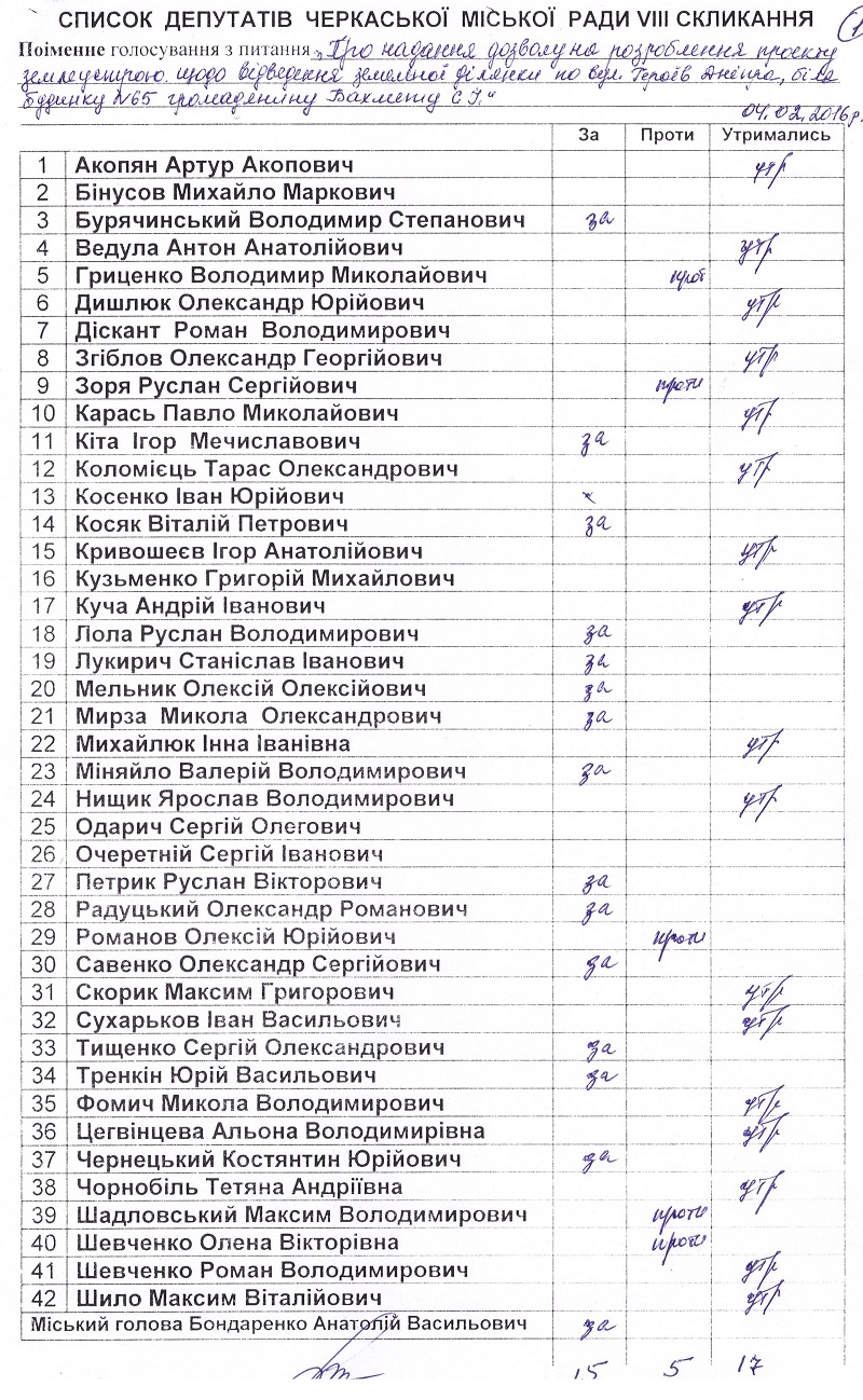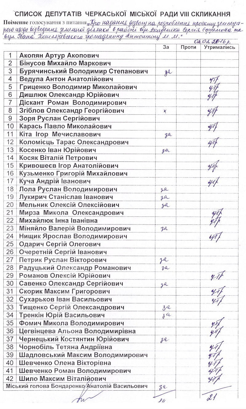 4 лютого відбулося сьоме пленарне сесії Черкаської міської ради з розгляду земельних питань. Оприлюднюємо результати поіменного голосування з двох питань – про надання дозволу на розроблення проекту землеустрою щодо відведення земельної ділянки по вул. Героїв Дніпра, біля будинку № 65 в оренду для будівництва тимчасового гаражу (інваліду 2 групи) та про надання дозволу на розроблення проекту землеустрою щодо відведення земельної ділянки в районі вул. Академіка Сергія Єфремова та вул. Івана Котляревського учаснику АТО.