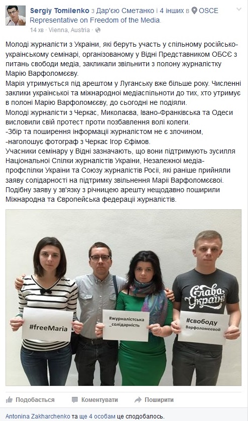 Учасники семінару у Відні зазначають, що вони підтримують зусилля Національноі спілки журналістів України, Незалежноі медіапрофспілки України (НМПУ) та Союзу журналістів Росії (СЖР), які раніше прийняли заяву солідарності на підтримку звільнення Марії Варфоломеєвої. Подібну заяву у зв'язку з річницею арешту нещодавно поширили Міжнародна та Європейська федерації журналістів.