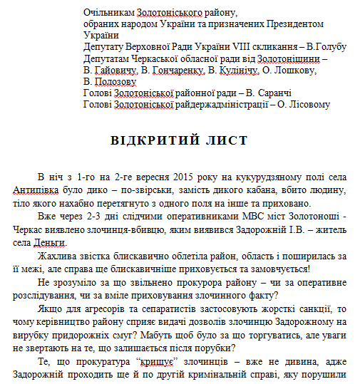 Віталій Полях завертається до «обранців та керівників Золотоніщини» із закликом звернути увагу на «таку резонансну та ганебну подію в районі». «Не тільки винні у злочині особи повинні понести справедливе покарання, а ті слідчі, судді та прокурори, що сприяють закриттю таких дико-звірячих випадків!» – переконаний екс-нардеп.