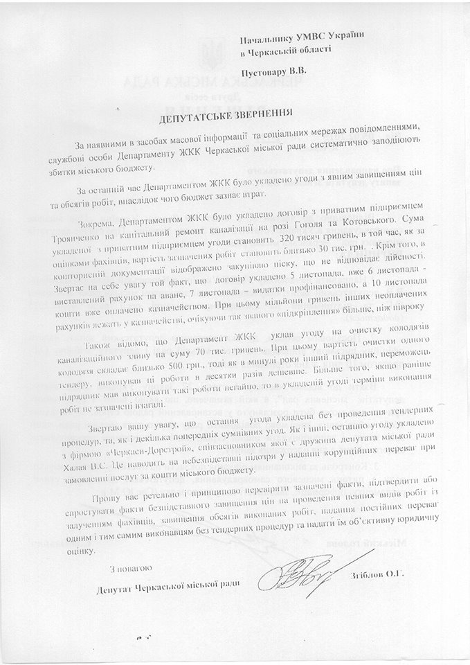 «Прес-служба черкаської поліції рапортує про успішне розслідування злочину посадовими особами мерії... Про всяк випадок нагадаю, що повідомлення про злочин я підписав і направив пану Пустовару більше року тому - 5 лютого 2015. Так само нагадаю, що Кримінально-процесуальний кодекс дає правоохоронцям лише 2 місяці на розслідування справи. Звертаю увагу, що станом на момент звернення (рік тому) вже були всі докази у справі (договора, платіжки, акти виконаних робіт, банківські проводки тощо)».