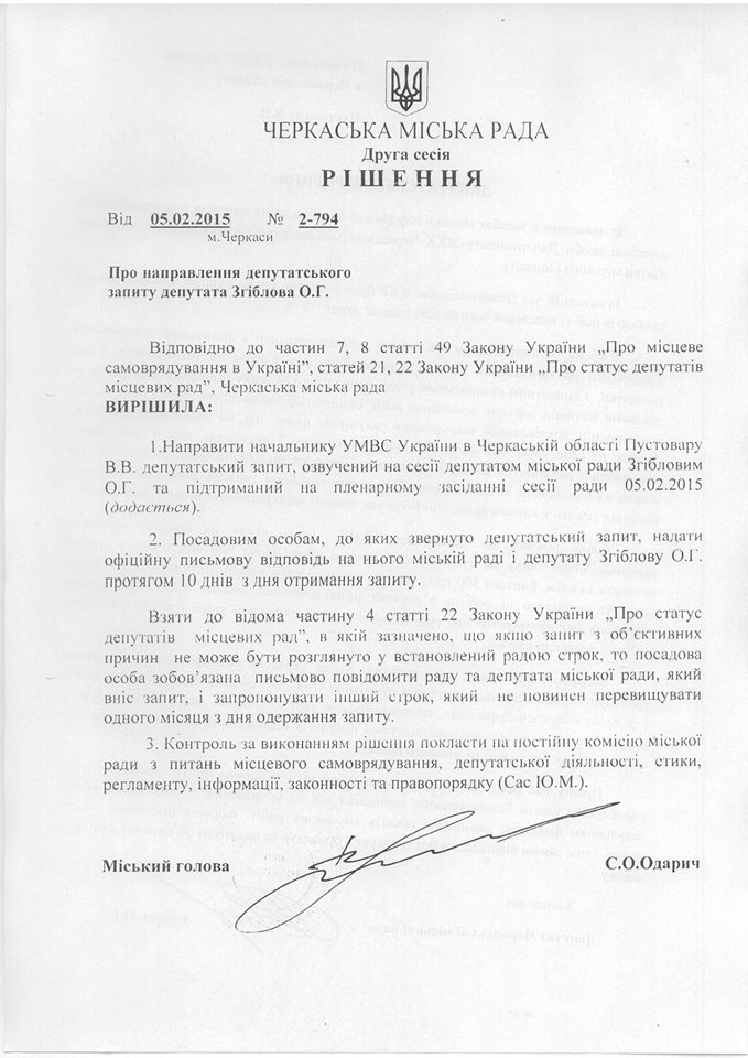 «А тепер кілька запитань:1) Чому цілий рік поліція нічого не робила? 2) За цей рік Наумчук і Отрешко уклали з Трояченко ще кілька угод і вкрали з бюджету кілька сотень тисяч гривень. Хто їх має повернути - може, панове поліцейські, чия бездіяльність стимулювала злодіїв? 3) Коли у поліції дійде черга до справді масштабних схем - Канівської, Університетської, Сурікова, 5, 18 і 34 шкіл? Тут уже не сотні тисяч, тут – мільйони», - наголосив Сергій Одарич.