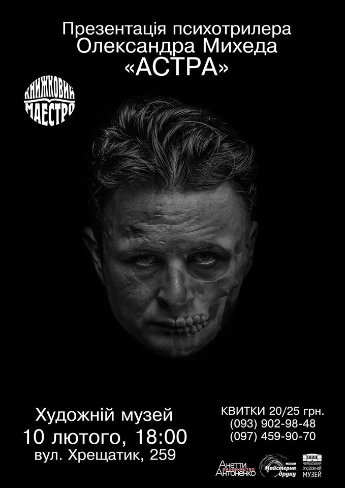 Цієї середи, 10 лютого о 18.00, громадська організація «Книжковий Маестро» запрошує на презентацію психотрилера Олександра Михеда "Астра". Зустріч, традиційно, відбудеться у Черкаському художньому музеї.