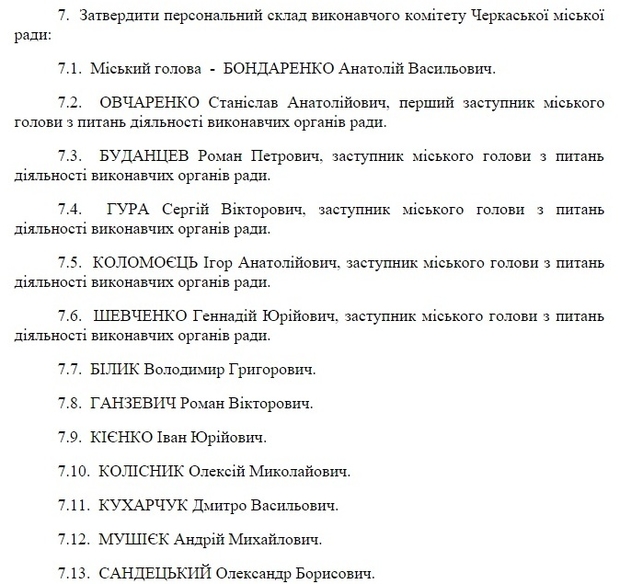 Разом з тим, повністю переформатований склад членів виконкому на громадських засадах. Зі старого списку залишився лише представник ПАТ "Азот", колишній член виконкому Олександр Сандецький. Додалися також екс-депутат міськради "батьківщинівець" Андрій Мушієк (син депутата обласної ради Михайла Мушієка), голова черкаського осередку ЦК "Азов" Дмитро Кухарчук, голова ГО "Черкаський союз учасників АТО" Олексій Колісник, радник голови Черкаської ОДА Володимир Білик та колишні члени виконкому – "самооборонівець" Іван Кієнко і "автомайданівець" Роман Ганзевич.