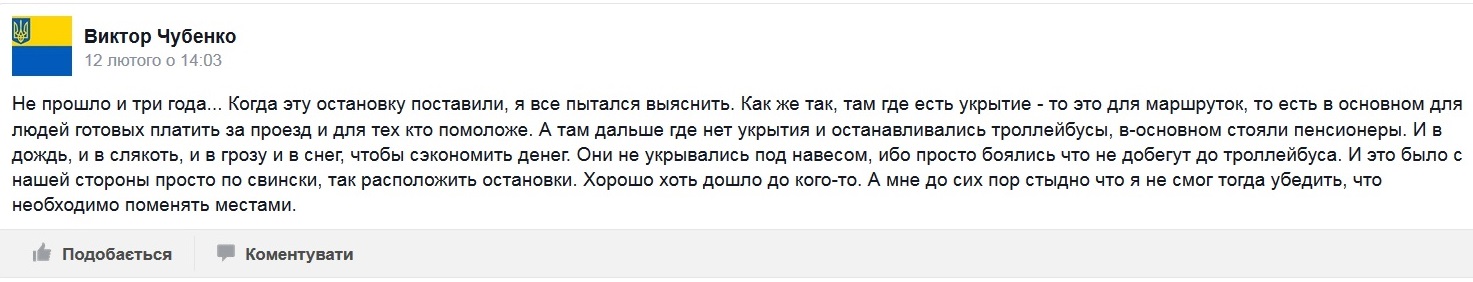 «Тепер тролейбусна зупинка розташована на початку – там, де зупинялися автобуси, а автобуси мають тепер зупинятися на 50 метрів далі – там де зупинялися тролейбуси... Але, якщо тролейбусники відповідально дотримуються змін і зупиняються у зазначених місцях, то приватні перевізники свідомо ігнорують ці зміни і зупиняються там де їм заманеться, тим самим створюючи незручності як самим пасажирам, які змушені бігати від зупинки до зупинки, так і водіям тролейбусів, не даючи їм можливості під’їхати і висадити пасажирів у зазначеному місці... Чому для когось правила існують і вони повинні їх дотримуватися, а інші мають право свідомо їх порушувати незважаючи ні на кого?», - пише Валерій Мироненко.