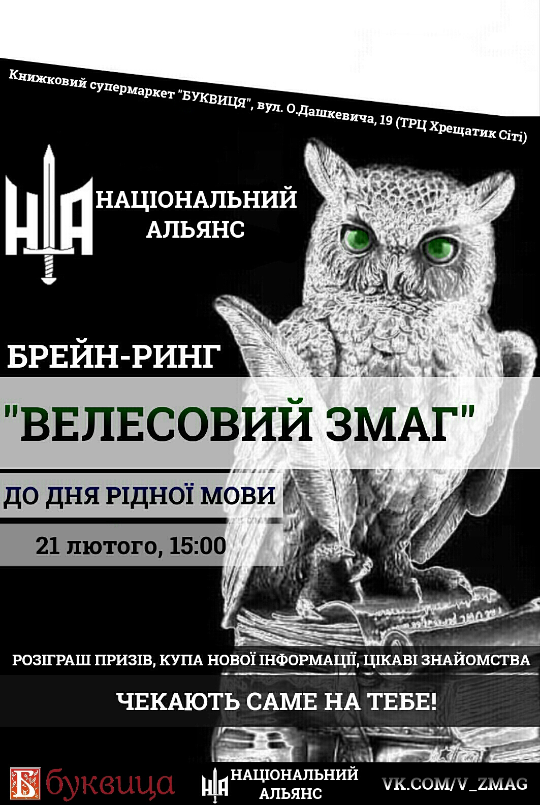 ГО «Всеукраїнський молодіжний рух «Національний альянс» у Черкаській області запрошує молодь Черкасвзяти участь у брейн-рингу "Велесовий Змаг" до дня рідної мови, який буде відбуватись 21 лютого (неділя) о 15:00, в книжковому магазині "Буквиця" ("Хрещатик-Сіті", Остафія Дашкевича 19)