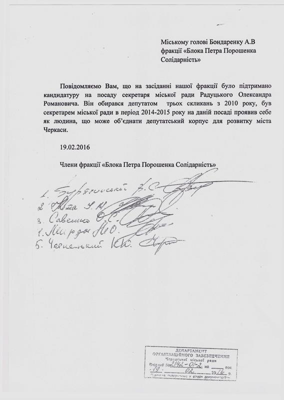 Члени фракції «Блок Петра Порошенка «Солідарність» у Черкаській міській раді звернулися до міського голови з листом, де просять висунути на посаду секретаря міської ради депутата Олександра Радуцького.