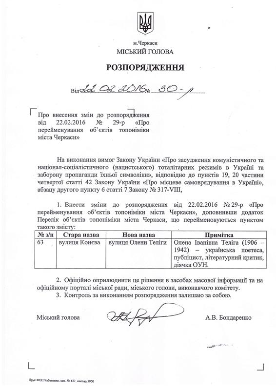 Теліга, розстріляна в 1942 в Бабиному Яру за відмову змириться з окупацією України, невизнання окупаційної влади та сворення Спілки українських письменників - з числа загальнонаціона льних Героїв України, яких належить увічнити в пам'яті народу. Але й Ваше зауваження - також слушне. Наприклад, іменем автора української Конституції черкащанина Михайла Сироти назвали куций провулочок - бувший Радянський...
