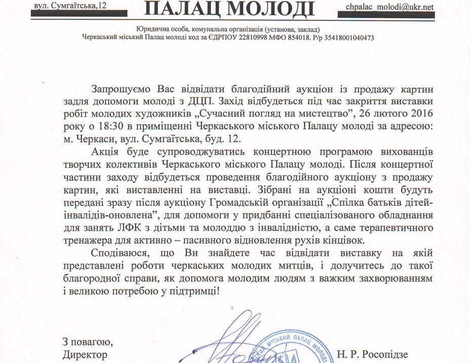 Сьогодні в Палаці молоді буде відбуватися благодійний аукцон продажу картин. Зібрані кошти будуть направлені на допомогу у придбанні спеціалізованого обладнання для занять ЛФК з дітьми та молоддю зінвалідністю в Громадську організацію "Спілка батьків дітей-інвалідів-оновлена" (вул. Конева, 15/1).