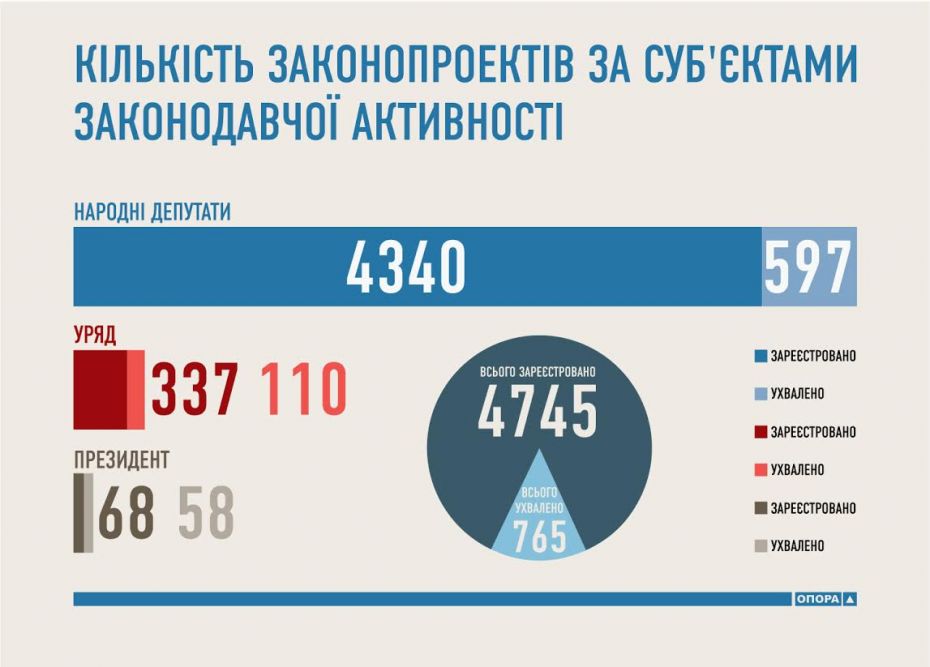 До слова, за перший рік роботи (тобто, станом на 25 листопада 2015-го року) Верховною Радою VIII скликання було розглянуто майже третину (28%) від усіх зареєстрованих законопроектів та проектів постанов Верховної Ради України, а саме 1344 з 4745. Були результативно проголосовані та стали законами 765 законодавчих ініціатив, що складає 16% від загальної кількості зареєстрованих у Парламенті проектів нормативних документів і 57% від числа розглянутих. Серед усіх законопроектів зареєстрованих протягом року саме народними депутатами Законами стали лише близько 14%. Слід відзначити також, що депутати-мажоритарники виступали авторами чи співавторами законопроектів лише у 38,9% випадків, тобто мають загалом нижчу продуктивність у законотворчості, ніж їхні колеги «списочники».