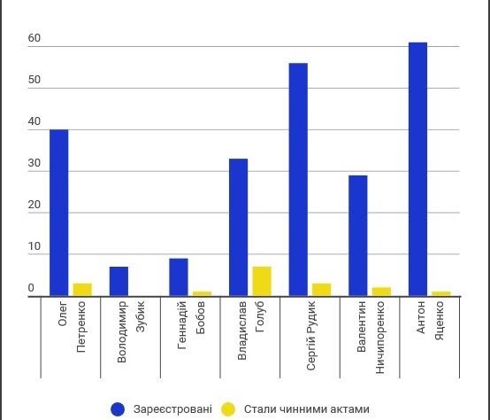 Лише 17 з усієї кількості поданих нашими мажоритарниками (а це трохи більше 7%) стали чинними актами. Для порівняння семеро мажоритарників від Хмельницької області зареєстрували 272 законопроекти, з яких лиш 19 стали чинними актами. Сімка нардепів від Івано-Франківщини виступали авторами, чи співавторами 287 законопроектів, 23 з яких стали чинними актами. У той час п’ятірка депутатів від Рівненщини подала 315 законопроектів і 35 з них стали чинними.