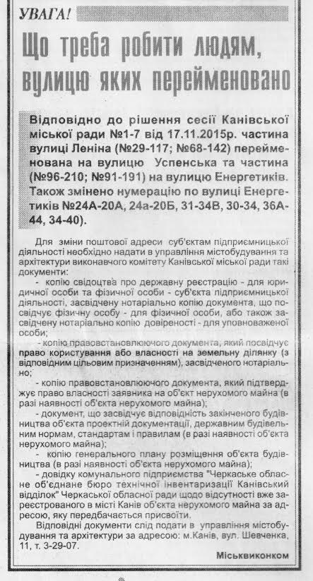 Крім того, у Каневі відбувається коригування Генерального плану, тож зібрані у зв’язку з перейменуванням документи допоможуть у роботі проектного інституту. Наразі увага управління зосереджена на колишній вулиці Леніна (тепер – дві вулиці, Успенська і Енергетиків). Крім того, в управлінні приймають не тільки нотаріально завірені копії, а й копії, правильність яких підтверджена самим підприємством.