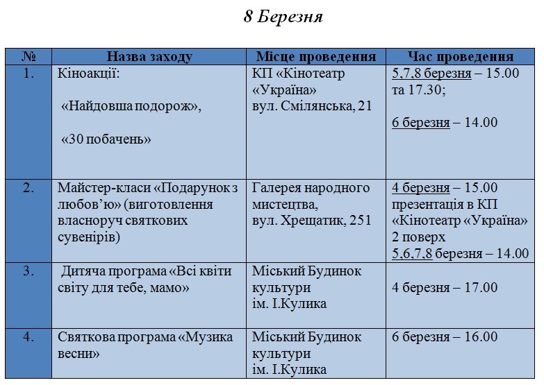 Усі жінки Черкас із нагоди свята 8 Березня матимуть змогу безкоштовно переглянути романтичні фільми. Переглянути їх можна з 5 по 8 березня у кінотеатрі «Україна», що на вул. Смілянська, 21.